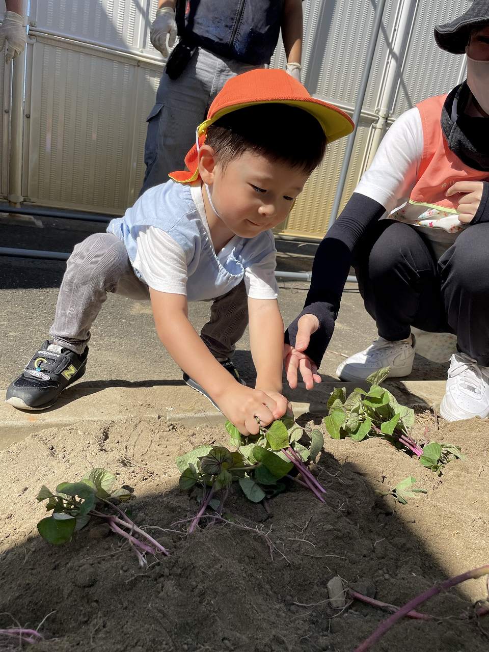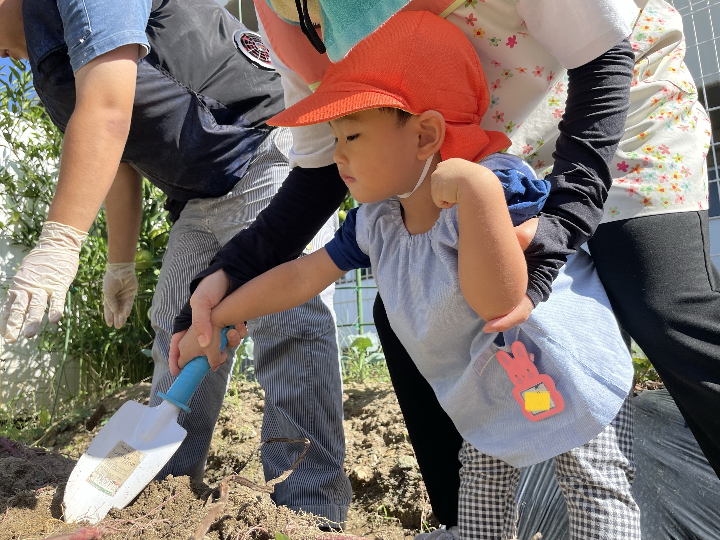 続いてぞうぐみさん(2歳児)です🐘「これひっぱる!」と苗を引っ張ったり、「でてきた!」と嬉しそうでした😊